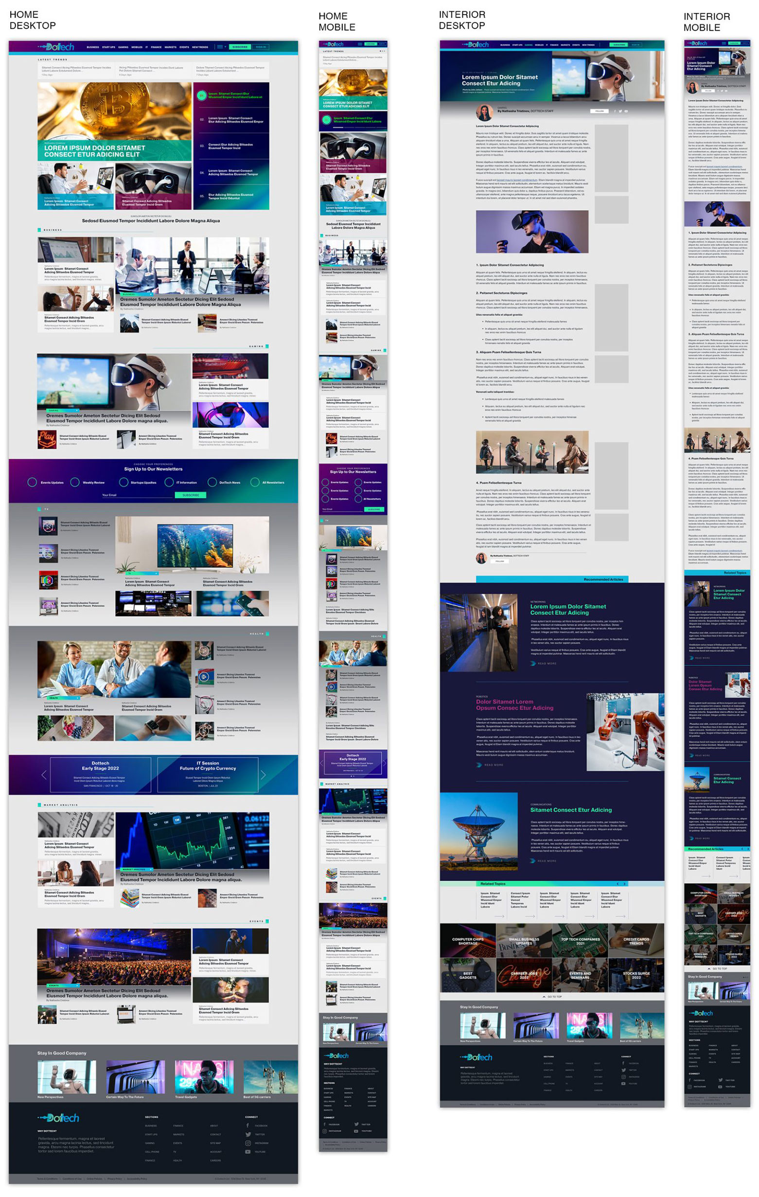 Two additional featured areas are displayed above the fold and showcase static information. Then, moving down to the content area, I created designated spots for articles related to Business, Gaming, Market Analysis, and Events. Finally, the design finishes with a footer section.