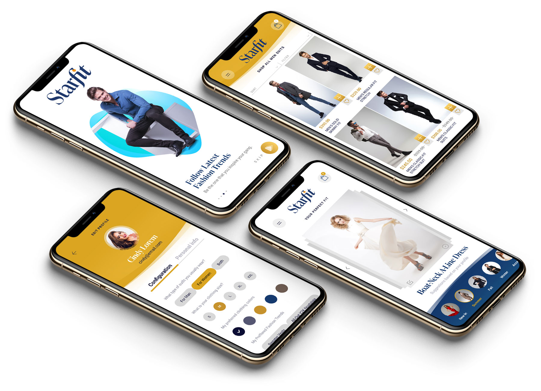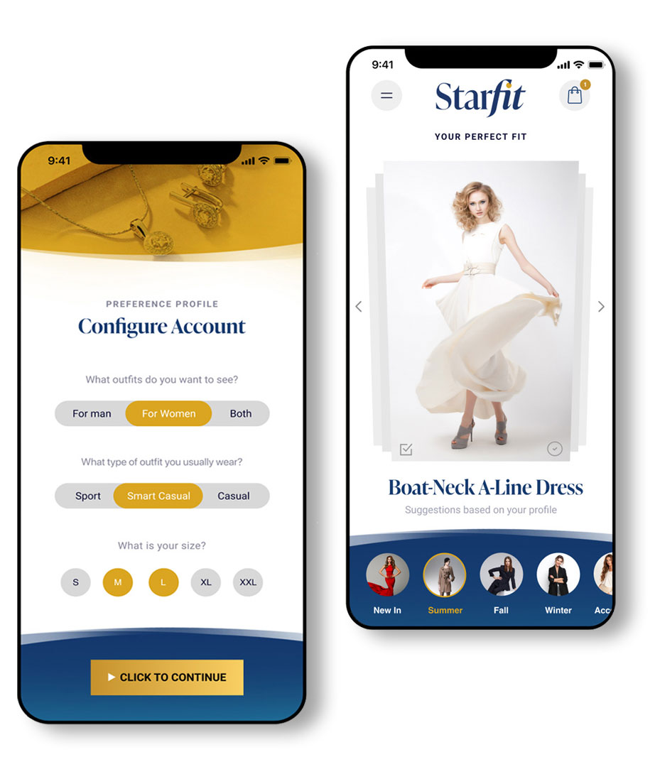 Leveraging advanced app intelligence based on market availability and personal preferences, Starfit provides individual clothing items or complete outfit suggestions.